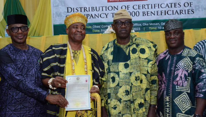 L-R: DG, Bureau of Lands and Survey, Arc. Segun Fowora; first receipient of the Ogun State Land Administration and Revenue Management System (OLARMS) and the Olu of Itori, Abdul-Fatai Akamo; representative of the Ogun State Governor and Secretary to the State Government (SSG), Mr. Tokunbo Talabi and the Commissioner for Housing, Hon. Jagunmolu Akande Omoniyi, during the distribution of 5,000 Certificates of Occupancy to beneficiaries at the Oba’s Complex, Oke-Mosan, Abeokuta, on Friday.